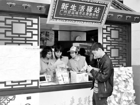 昨天下午當(dāng)班的黃洪丹,是廣東交通職業(yè)學(xué)院的大二學(xué)生,也是同行8人的班長(zhǎng)。她為記者一一介紹了站內(nèi)各種方便設(shè)施,告訴記者今天短短幾個(gè)小時(shí),她們已經(jīng)接待了100多位前來(lái)咨詢的朋友,“就是剛才,我們剛給一大幫外國(guó)朋友指了去亞運(yùn)村的路呢!