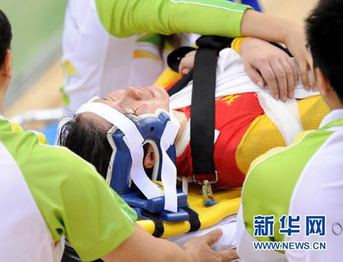 11月16日,中國(guó)選手湯科蓉在比賽中摔倒受傷后被擔(dān)架抬出賽場(chǎng)。隨后她因傷退出比賽。當(dāng)日,第16屆亞運(yùn)會(huì)場(chǎng)地自行車(chē)女子計(jì)分賽發(fā)生了嚴(yán)重的車(chē)輛相撞導(dǎo)致車(chē)手摔倒的事故,幾名選手因傷退出比賽。新華社記者李尕?cái)z