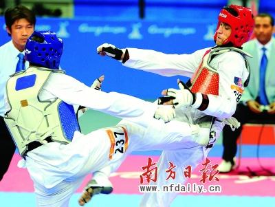 在跆拳道男子80公斤以下級決賽中,阿富汗選手內薩爾·艾哈邁德·巴哈維(右)以3比4負于約旦選手納比勒·哈桑,獲得亞軍。 新華社發(fā)