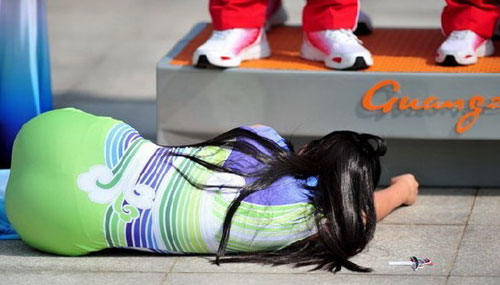 就在“暈倒姐”事件發(fā)生的前兩天,在亞運(yùn)會(huì)射擊比賽的頒獎(jiǎng)儀式上,一名叫蘇婉君的禮儀小姐也是托著裝滿獎(jiǎng)牌的盤(pán)子,累得發(fā)抖,幸被獲得冠軍的外國(guó)選手幫忙。據(jù)蘇婉君介紹,那個(gè)擺放了鮮花或獎(jiǎng)牌的托盤(pán)很沉,即使什么東西也不放,分量也是非常重的。