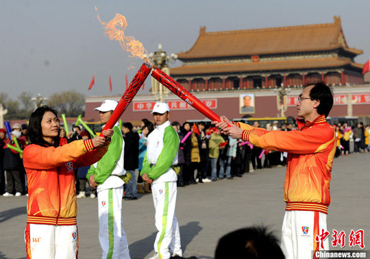10時21分,中共中央政治局委員、廣東省委書記汪洋用在北京中華世紀壇采集的圣火火種,點燃了火種盆。習(xí)近平神情莊重,從火種盤點燃火炬,然后高高舉起火炬,向人們展示。