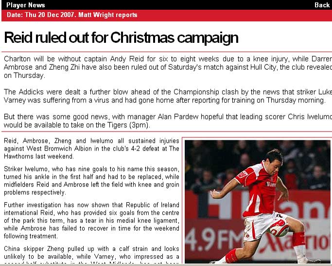 查爾頓目前雖然聯(lián)賽排名滑到第六,但是與榜首只有4分差距。對(duì)這支志在沖超的球隊(duì)來說,8名一線隊(duì)員因傷缺陣絕對(duì)是個(gè)壞消息。隊(duì)長里德膝蓋的傷勢(shì)不輕,至少需要休戰(zhàn)6-8周,查爾頓將面臨嚴(yán)峻的挑戰(zhàn)。