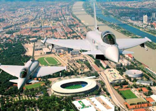 奧地利空軍為確保歐洲杯期間主賽場(chǎng)的安全,派出最新裝備的EF2000“陣風(fēng)”式戰(zhàn)斗機(jī)執(zhí)行空中巡邏任務(wù),以確保比賽的安全。