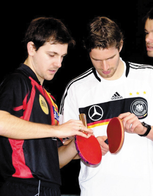 波爾是德國乒乓球的標(biāo)志性人物,而在德國最為普及的足球運動里,也有不少國腳喜歡打乒乓球。北京時間昨天凌晨,德國國家隊在柏林奧林匹克球場進行訓(xùn)練,在新聞發(fā)布會開始前,為廣大中國球迷熟悉的乒乓球選手波爾看望了國家隊的隊員,他同韋斯特曼和弗雷德里希切磋了乒乓球技,跟波多爾斯基等球員一起合影。另外,《越獄》德語版主題曲的演唱者、著名歌手阿德爾也來到國家隊,他和波爾一起同國腳們合影留念。