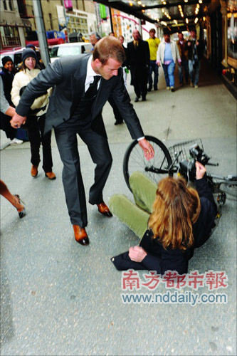 在阿湯哥位于曼哈頓的公寓外,面對狗仔鏡頭的阿湯哥意氣風發(fā),倒是貝克漢姆有些靦腆,帶著辣妹和三個兒子的他,處處顯示出一個成熟男人的紳士風范。有趣的是,一名狗仔對準小貝拍照的時候被路邊的自行車絆倒,右手牽著妻子的貝克漢姆還極其紳士地伸出另一只手上前將她扶起來。