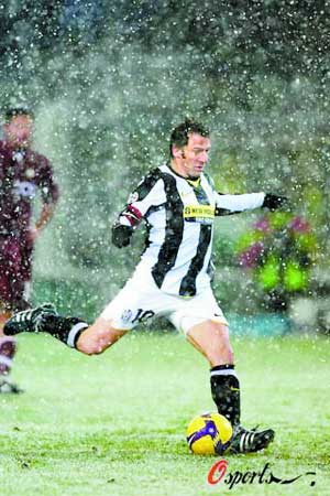 這是皮耶羅的第577次代表尤文圖斯出戰(zhàn),同時也是他的第380場聯(lián)賽。由瓢潑大雨到漫天飛舞的大雪,都靈奧林匹克體育場今晨的天氣非常惡劣,但這樣惡劣的條件阻攔不住德皮進(jìn)球的欲望,尤文每當(dāng)發(fā)動有威脅的進(jìn)攻,皮耶羅幾乎都有份參與。卡莫拉內(nèi)西在開場僅5分鐘就受傷,他在爭頂落地時摔傷右肩,右臂此后幾乎不敢動彈,只能吊著肩膀奔跑。尤文急需進(jìn)球,主帥拉涅利很殘忍,他讓卡莫拉內(nèi)西繼續(xù)留在場上。尤文在第27分鐘打破僵局,皮耶羅背對球門送出令人匪夷所思的腳跟妙傳,內(nèi)德維德左路傳中,卡莫拉內(nèi)西勁射在橫梁下方飛入網(wǎng)窩。慶祝的方式很別扭,卡莫拉內(nèi)西連后退再擺左手,仿佛對隊友說:“別過來,不要碰我,我的右臂很痛!笨瓋(nèi)西在第44分鐘右路傳中找到阿毛里,后者爭頂后右腳掃射入網(wǎng),尤文把領(lǐng)先優(yōu)勢擴(kuò)大到兩球。拉涅利懸著的心終于放下,他允許卡莫拉內(nèi)西退下火線,換上馬基奧尼。馬基奧尼在第62分鐘開出皮耶羅創(chuàng)造的任意球,中后衛(wèi)基耶利尼頭球攻門把比分改寫成3比0。