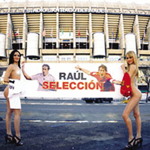 兩個巴西美女比西班牙大多數(shù)的足球記者們更懂足球,她們談起皇馬的技戰(zhàn)術(shù)來頭頭是道。為了支持勞爾重返國家隊,近日,她們在伯納烏球場前做出大膽舉動,不惜為自己的偶像犧牲個人形象!皠跔栠@個賽季已經(jīng)打入了20個進(jìn)球,他是冠軍聯(lián)賽、西班牙國家隊和皇馬俱樂部的歷史最佳射手,同時又狀態(tài)正佳,如果博斯克不把勞爾重新招入國家隊的話,那我們實(shí)在無法理解!
