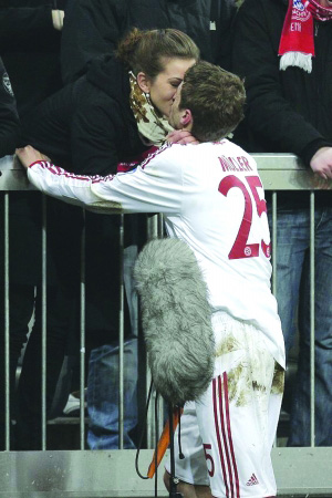 這位在租借而來的前鋒多諾萬回到美國大聯(lián)盟之后才得到出場機會的小將,在昨晨比賽的第72分鐘登場,這也是他在歐冠聯(lián)賽中的處子秀,然而17分鐘過后,他就在一次角球混戰(zhàn)中攻入了個人的歐冠聯(lián)賽處子球。進球后的穆勒顯得非常興奮,飛奔到看臺上女友所在的位置,而他的女友很默契地送上了浪漫一吻?吹竭@對恩愛的小情侶,現(xiàn)場所有觀眾都送出了自己的掌聲。