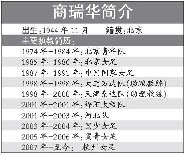 商瑞華是中國女子足壇的元老級人物,中國女足運動開端之后的優(yōu)秀球員均在其手下效力過,包括李秀馥、吳偉英、劉愛玲、溫莉蓉、孫雯等人。雖然在率隊參加的1991年首屆女足世界杯賽上,中國女足因負于瑞典隊而無緣4強,但這支國家隊奠定了中國女足在1996年、1999年兩奪世界亞軍的基礎(chǔ)。離開主教練崗位后,商瑞華曾先后以助理教練的身份執(zhí)教男足的大連萬達隊、天津泰達隊,擔(dān)任過四川綿陽隊主教練,隨后又任職河北女足、中國女足青年隊,目前在杭州女足任教。