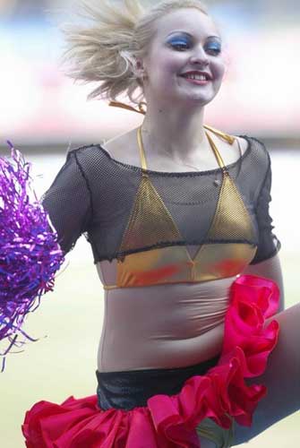 大連大概不懂不能搶戲份的道理,把首輪戰(zhàn)也搞得像春晚一樣很紅很喜慶,洋妞助威團(tuán)的獻(xiàn)藝大有喧賓奪主之意。握有中超開幕式導(dǎo)演聘書的或許很不屑這草臺(tái)班子,但我作為一名正直的觀眾卻很喜歡這至少握上去更實(shí)實(shí)在在的一圈腰間贅肉——哈,小腹婆,很可愛!