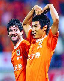 下半時(shí)剛剛開(kāi)始3分鐘,王永珀在前場(chǎng)右側(cè)轉(zhuǎn)移,曲波冒頂之后日夫科維奇再次把球傳向禁區(qū),米利安頭球橫擺,韓鵬小禁區(qū)內(nèi)倒地凌空將球打進(jìn)。漂亮的進(jìn)球幫助泰山打開(kāi)了僵局,“其實(shí)我的體能還沒(méi)有完全恢復(fù),在場(chǎng)上跑起來(lái)感覺(jué)比較沉!表n鵬在賽后說(shuō),“奧運(yùn)會(huì)之后自己的狀態(tài)不算好,通過(guò)這場(chǎng)比賽我又重新找回了在球門(mén)前的感覺(jué)。距離第一個(gè)進(jìn)球僅過(guò)了7分鐘,呂征在右路送出準(zhǔn)確傳中,皮球越過(guò)后衛(wèi)正好飛到韓鵬的上空,后者中路搶點(diǎn)頭球破門(mén),奠定勝局。