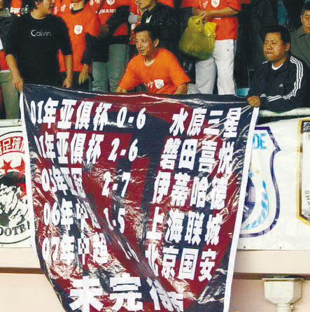 廣州醫(yī)藥隊(duì)0比6慘敗給亞泰,這場(chǎng)比賽引來(lái)無(wú)數(shù)質(zhì)疑。上海球迷打出這個(gè)標(biāo)語(yǔ)表示廣州隊(duì)的表現(xiàn)太對(duì)不起中超的球迷。