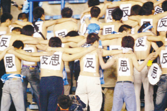 大連不愧為中國(guó)的足球城。2006年5月21日,一群大連球迷在看臺(tái)上光起膀子,背后貼滿(mǎn)了“反思”,這是中國(guó)球迷最真切的想法?上,中國(guó)足球沒(méi)有停止過(guò)反思,只是很少采取行動(dòng)。