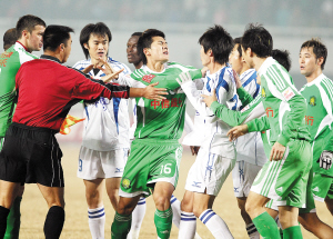 應(yīng)該說京津兩隊賽前在心態(tài)調(diào)整上都下了一番工夫,前79分鐘的較量場面平穩(wěn),即便康師傅隊當(dāng)時2∶1領(lǐng)先,兩隊隊員的情緒和動作也都在合理范圍之內(nèi)。比賽的轉(zhuǎn)折點出現(xiàn)在第79分鐘,外援馬基奇在本方禁區(qū)弧頂處一次合理的爭頂,卻被外籍主裁阿卜杜拉判罰犯規(guī),而國安正是憑借這次任意球機(jī)會由陶偉主罰破網(wǎng),將比分扳平。賽后康師傅隊認(rèn)為此球絕對沒有犯規(guī),當(dāng)事人馬基奇甚至反復(fù)向大家重復(fù)著當(dāng)時的動作,因此球隊上下認(rèn)為正是此次誤判成為隨后騷亂的導(dǎo)火索。最讓康師傅隊無法接受的是,國安扳平比分幾分鐘后,楊智在禁區(qū)內(nèi)撲倒吳偉安,但這位外籍主裁判罰吳偉安沖撞門將犯規(guī),連續(xù)的誤判讓康師傅隊員的情緒一下子激動起來,以至于蒿俊閔在補(bǔ)時1分鐘時因為一個邊線球的判罰向邊裁做了一個極不禮貌的動作,主裁最后只能以黃牌加以平息。非常遺憾的是,這次和裁判的沖突只是導(dǎo)火索,誰都沒想到的是曹陽第94分鐘倒鉤射門后,張永海與路易斯再次發(fā)生了推搡,結(jié)果兩隊替補(bǔ)隊員涌入場地,使得比賽場面異常混亂,最后外籍裁判掏出紅牌將假摔的張永海罰出場,但這個判罰如同火上澆油,不僅讓場內(nèi)球員情緒更加失控,而且看臺上的球迷也受到刺激,讓沖突繼續(xù)升級,這也給賽后豐臺體育中心變成全武行的戰(zhàn)場埋下了伏筆。
