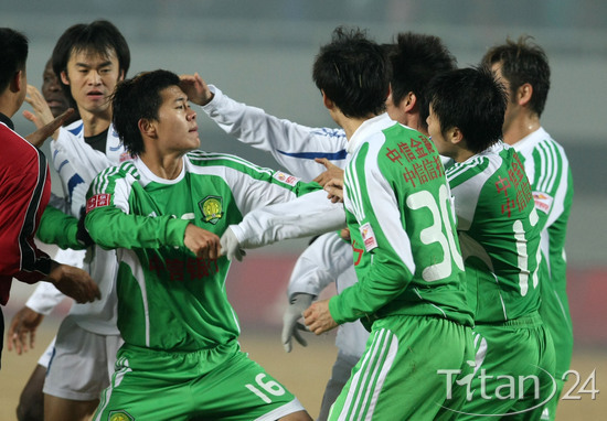 11月12日,北京國安與天津泰達賽后,雙方爆發(fā)斗毆,黃博文(16號)與對方毆打。圖片來源:體壇網(wǎng)