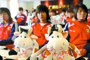 昨天是圣誕節(jié),正在廣州集訓(xùn)的中國(guó)女足首次亮相越秀山體育場(chǎng)。在參加由四國(guó)女足邀請(qǐng)賽冠名贊助商南方人才市場(chǎng)主辦的新聞發(fā)布會(huì)時(shí),球員們收獲了一份意外的“圣誕禮物”:身上印有“kiss me (親我)”英文字樣的奶牛公仔。贊助商這一別出心裁的禮物,讓包括韓端、畢妍在內(nèi)的女足姑娘們個(gè)個(gè)愛不釋手。