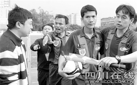 比賽開始后,雙方對(duì)抗異常激烈,球員屢屢倒地,但裁判的哨聲卻比較松。下半場(chǎng),莫偉聰?shù)纳诼曉絹碓狡,多次判給南昌前場(chǎng)定位球,好在門將徐洋表現(xiàn)神勇,加上門柱再一次幫忙,川足頂住了最危險(xiǎn)的一段時(shí)間。不過此時(shí),最不可思議的一幕出現(xiàn)了,騰彬又一次被放倒,躺在地上沒起來,暫停了比賽的莫偉聰跑過來,和對(duì)方門將一起拉他起來,嘴里還喋喋不休。這時(shí)候,他突然又和一旁的周威理論起來,并出示了一張黃牌。下場(chǎng)后,周威向記者描述了當(dāng)時(shí)的情形——原來,莫偉聰在騰彬起身后,竟自言自語地罵道:“這幫傻X,就會(huì)假摔!辈涣媳恢芡犚姡|(zhì)問他為何罵人,莫偉聰爭(zhēng)辯了幾句,掏出黃牌。