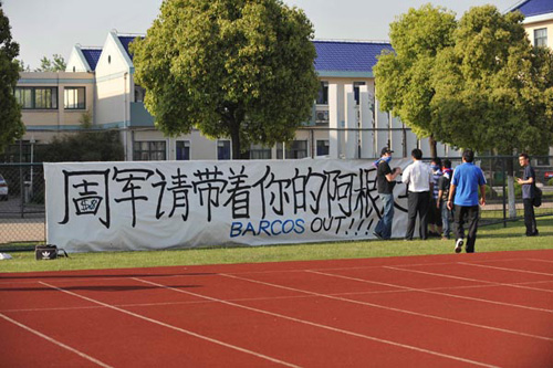 由于7日是申花的訓(xùn)練開放日,因此這幾名球迷進(jìn)入基地一開始并未引起大家的注意,不過當(dāng)他們?cè)噲D在申花宿舍樓對(duì)面的鐵絲網(wǎng)展開這個(gè)橫幅時(shí),俱樂部工作人員趕緊進(jìn)行了阻攔,并將他們“友好”的請(qǐng)出了基地。