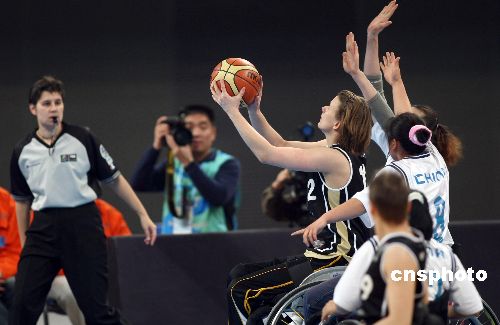 國(guó)際輪椅籃球邀請(qǐng)賽中國(guó)男隊(duì)無力阻擋荷蘭男隊(duì)進(jìn)攻。