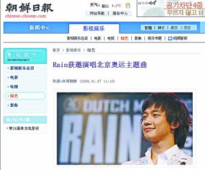 據前日的《朝鮮日報》報道稱,韓國藝人Rain(鄭智熏)獲邀演唱北京奧運主題曲。朝鮮日報報道稱:“據悉,北京奧委會2007年曾向Rain發(fā)出邀請,希望他能夠演唱奧運主題曲!璕ain欣然接受了邀請,目前正在與北京奧委會(注:應為北京奧組委)方面談具體事宜!
