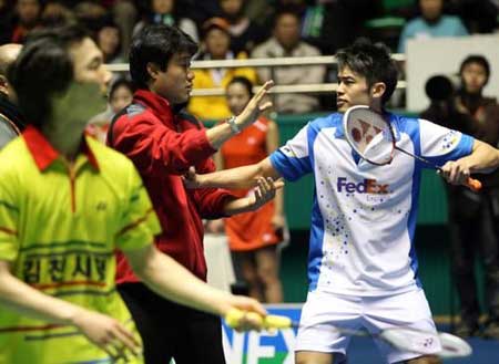 昨天結(jié)束的韓國羽毛球公開賽傳出了不和諧的聲音,中國隊(duì)男單頭號種子林丹在決賽中以1比2不敵東道主選手李鉉一,林丹險(xiǎn)些與李鉉一的教練、前中國男隊(duì)主帥李矛動武。他憤怒地把手中的拍子砸向李矛,兩人幾乎要打架,幸虧旁人將他們分開。另外,中國隊(duì)丟掉了女單冠軍,小將盧蘭在決賽中不敵代表中國香港隊(duì)的前中國隊(duì)主力周蜜。