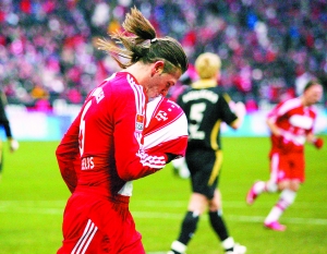 最先掀起“愛情風(fēng)暴”的是當下狀態(tài)大勇的法國球星里貝里,他本場特意穿上粉紅球鞋戴上紅色手套,活脫脫一個紅色小精靈。第29分鐘他的任意球直接破門,為球隊很快扳平了比分。這也是里貝里連續(xù)第6場聯(lián)賽進球,激動的他在進球后特別親吻了寫有妻子瓦希芭(Wahiba)名字的左手腕繃帶。半場結(jié)束前,中衛(wèi)德米凱利斯收獲進球。阿根廷人進球后令人意外地撿起球?qū)⑺M球衣里,做出孕婦的姿勢。原來這一幕是獻給他已經(jīng)懷孕的女友伊萬格利娜的。下半場,拜仁的進球風(fēng)暴并未停歇,而表達愛意的慶祝動作也似乎可以傳染?寺鍧蓪⒗镓惱锏膫髦星蝽斎牒,伸出三根手指,指代妻子希爾維婭和雙胞胎兒子。此后托尼和奧多配合后破門,意大利人也特別親吻著左手,原來大拇指上戴有未婚妻瑪塔送他的戒指。