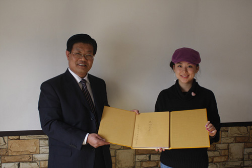 “九球天后”接過(guò)興隆塔文冊(cè)。