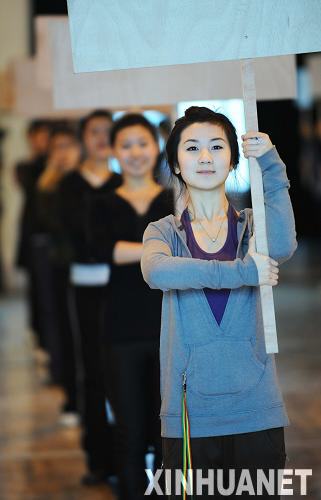 11日12時40分,70個女孩來到現(xiàn)場后,持牌手的總教練汪燕引導(dǎo)女孩們進行走位,讓女孩熟悉開幕式當(dāng)天的入場順序,這是進入場館訓(xùn)練的第三天。汪燕是黑龍江職業(yè)技術(shù)學(xué)校的校長,據(jù)她介紹,這70個女孩都是大冬會禮儀小姐,其中有44個女孩是倍受矚目的持牌手。