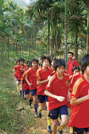 瓊中女足的訓(xùn)練場坐落在縣中學(xué)里,操場四周包裹著高大的檳榔樹和橡膠樹,在霧氣中顯得十分幽靜!鞍亚騻鞒鋈ィ趺茨敲椽q豫呢!”一個沙啞的聲音打破了沉靜。