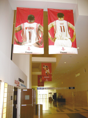 【鏡頭一】從豐田中心正門進(jìn)去,首先進(jìn)入眼簾的,是掛在空中的兩個巨大背影——姚明和麥迪,遠(yuǎn)處是威爾斯和阿爾斯通。(下左圖)