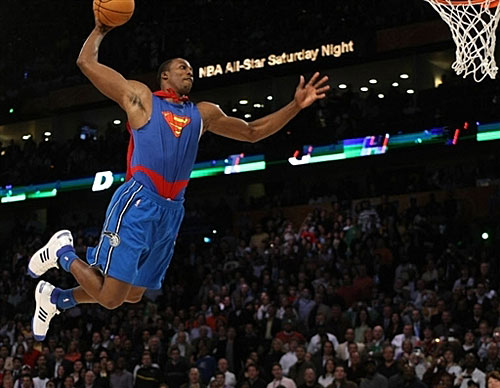 中新網(wǎng)2月18日電 2008年NBA全明星賽扣籃大賽北京時間2月17日上午舉行,魔術(shù)隊中鋒德懷特-霍華德的扣籃創(chuàng)意獨(dú)特,征服現(xiàn)場評委和賽場內(nèi)外球迷。其中扮演“超人”的一扣更是技驚四座。最終他以高達(dá)78%的球迷支持率成功當(dāng)選今年的“扣籃王”。