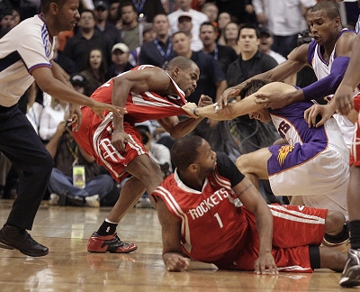 從洛杉磯倉(cāng)皇逃離,來(lái)到鳳凰城的火箭需要一劑神奇的療效藥,幸運(yùn)的是,他們昨晚得到了,火箭的全體球員都恢復(fù)得很好,他們最終以94比82擊敗太陽(yáng)。有意思的是,最大限度刺激球迷神經(jīng)的不是經(jīng)典的“姚鯊對(duì)決”,也不是奧尼爾超越哈夫里切克成為歷史得分王第十,更不是麥迪的27分,而是阿爾斯通引發(fā)的群毆。這場(chǎng)群毆幾乎囊括了在場(chǎng)的全部10名球員,最終導(dǎo)致2人被罰出場(chǎng)、3人吃到技術(shù)犯規(guī)。