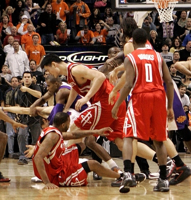 休斯敦媒體稱(chēng)之為“不愉快的事情”,這不愉快的事情發(fā)生在第三節(jié)還剩27秒時(shí),那時(shí)麥迪命中三分球讓火箭取得74比55領(lǐng)先。阿爾斯通為麥蒂掩護(hù),在被太陽(yáng)球員巴恩斯用肩膀推搡后沖上去回?fù)袅撕笳。兩人在中圈附近大罵垃圾話(huà)。麥迪和姚明率先跑上去掩護(hù)阿爾斯通,納什沖了過(guò)來(lái)卻被麥迪推倒,更大一號(hào)的“大鯊魚(yú)”奧尼爾也沖了上來(lái),用他的大手又將麥迪和姚明推到在地,甚至連裁判也不能幸免……雙方隊(duì)員混作一團(tuán),相互拉扯推搡。最終,始作俑者阿爾斯通和巴恩斯都被罰出場(chǎng),麥迪、納什和奧尼爾則各收獲1次技術(shù)犯規(guī)。