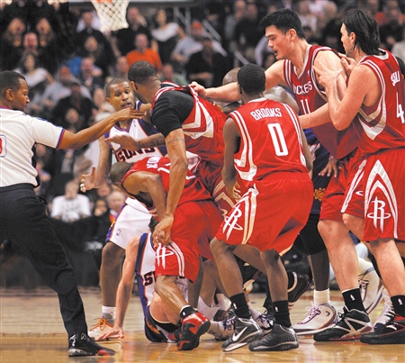 在第三節(jié)將結(jié)束時,火箭大比分領(lǐng)先太陽,但就在此時太陽隊后衛(wèi)巴恩斯一次惡意肘擊,激怒了阿爾斯通,兩人隨即從口角變?yōu)殡p拳相向。眼見戰(zhàn)火燃起,雙方球員都不想讓自家兄弟吃虧,因而即刻加入到了“戰(zhàn)斗”之中,有像姚明一樣勸架的,也有像麥迪一樣上前幫忙的,一時間場面之混亂連解說員都手足無措,一個勁兒驚恐道——“oh,god!”
