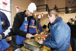 昨天,易建聯(lián)(左圖左一)和卡特、哈里斯等籃網(wǎng)隊員一起來到新澤西的一家教堂,在感恩節(jié)到來之際,向當?shù)厣鐓^(qū)貧困居民分發(fā)食品。在活動現(xiàn)場,易建聯(lián)身著便裝頭戴一頂繡有籃網(wǎng)標志的廚師帽發(fā)放食物,整個活動過程中易建聯(lián)始終面帶微笑,并和獲贈食物的居民親切交談。
