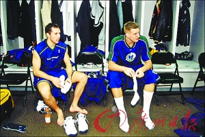 反正在賽前,你絕對(duì)見(jiàn)不到更衣室里人員扎堆的情況。賽場(chǎng)上練完投籃的人,還會(huì)跑到更衣室練點(diǎn)別的;在更衣室里按摩的人,弄完之后也會(huì)跑到賽場(chǎng)上再練會(huì)。而且,大家練習(xí)的時(shí)間也不一樣。有的人練得早,有的人出來(lái)得晚,在這樣的情況下,你要看到球員聊天說(shuō)話,實(shí)在不是一件容易的事情。一般也就一兩個(gè)球員碰到一起,換衣服的時(shí)候、吃東西的時(shí)候,才會(huì)相互聊上兩句。要想在賽前采訪球員,除了等待,還得看運(yùn)氣。