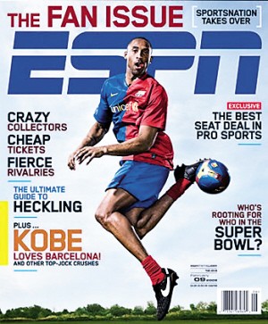 科比無疑是NBA的天王級(jí)巨星,同時(shí)他也是一名巴薩的狂熱支持者。日前某雜志記者采訪了科比,并且將一件印有“布萊恩特”的巴薩24號(hào)球衣送給了小飛俠。大喜過望的科比隨后又在ESPN雜志的邀請(qǐng)下,身穿巴薩球衣拍攝起了一組足球?qū)懻?如圖),在球場上大秀腳法。