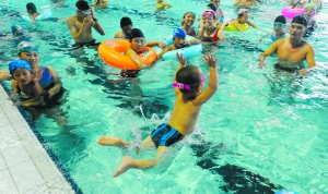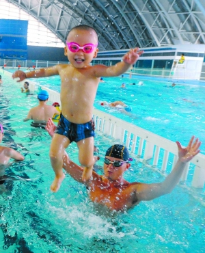 伸伸腿,彎彎腰,一番準(zhǔn)備后,小劉暢迫不及待地跑到泳池邊,父親劉先生抱起兒子,撲通一聲丟下水,接著又一把撈了起來。記者嚇了一跳,耳邊卻傳來小家伙“咯咯”的笑聲!拔医o他試試水,適應(yīng)一下。”劉先生解釋,劉暢不怕水,對(duì)水有一種天生的親切感,這種夸張的“試水”方式,不會(huì)嚇到他,反而讓他感覺很“爽”。