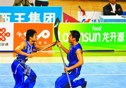 緊接著四川隊又重蹈覆轍。他們表演的項目是雙刀進槍,也就是一名隊員持雙刀與一名持長槍的隊員進行對抗。他們斷槍的過程更快,比賽剛開始沒多久,長槍與雙刀接觸后,槍頭突然飛了出去。這樣,他們也沒有了比賽成績。