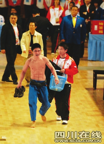同樣,在比賽中受傷的山西隊(duì)楊波在男子60公斤級比賽中迎戰(zhàn)解放軍隊(duì)阿拉木斯時,在比賽后借勢坐在場地上拒絕離開,并怒砸場地。而女子48公斤級決賽中,四川隊(duì)選手龔華也站在場地拒絕離場,在裁判交涉后才離開場地。