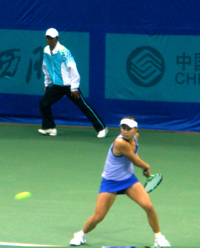 一襲紫裝、淺笑盈盈,率領(lǐng)天津隊奪得了中國第十一屆運動會濟(jì)南賽區(qū)首枚金牌的彭帥,和隊友李喆信步走進(jìn)中心賽場。四年前的南京,同樣是這個天津姑娘,十九歲的她站在領(lǐng)獎臺上淚流滿面,隨即賭氣似地摘下項上的銀牌。誰都知道,她想要的是金牌。四年后的濟(jì)南,十一運會網(wǎng)球女子團(tuán)體賽中她拿到了金牌。今天,她又微笑著回來了。在今天上午的女子單打中,彭帥當(dāng)仁不讓,以二比零橫掃北京隊趙依靜。