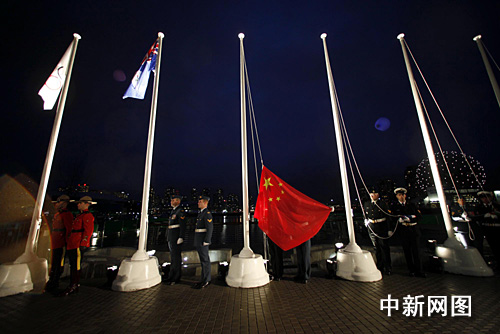 中國(guó)代表團(tuán)今天與開(kāi)曼群島、朝鮮、伊朗和塞爾維亞等代表團(tuán)一起舉行升旗儀式,東道主用一段激情的土著舞蹈對(duì)客人的到來(lái)表示歡迎。
