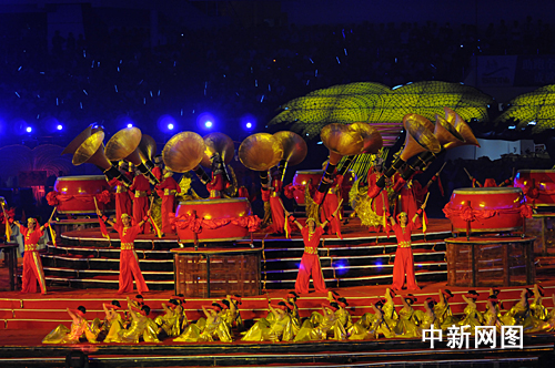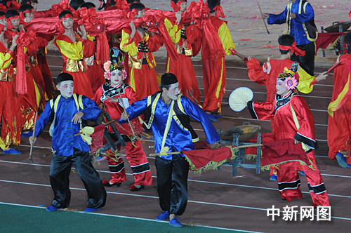在運(yùn)動(dòng)員入場式后,以“歡樂農(nóng)運(yùn)•親情海峽•和諧中華”為主題的大型文體表演《大地情飛揚(yáng)》正式開始。整臺(tái)節(jié)目具有濃郁的閩南地域文化特色,為觀眾獻(xiàn)上了一道氣勢磅礴的視覺大餐。