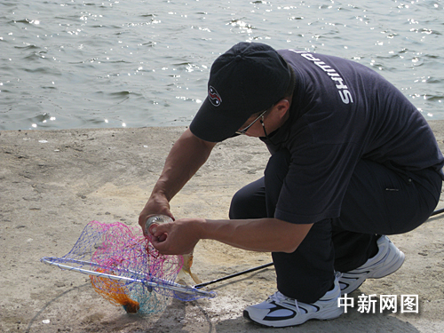 有一名來自安徽的選手顯然是這路“武功”里的豪放派。當魚急著四處游走想擺脫魚鉤的束縛時,這位“大俠”卻好整以暇地以單手控竿,巧妙地跟著魚的力量調(diào)整好釣線的角度,最后猛地使出一個“拔蔥式”——一條大魚頓時從水里“一飛沖天”,頗為委屈地重重拍在了地上。