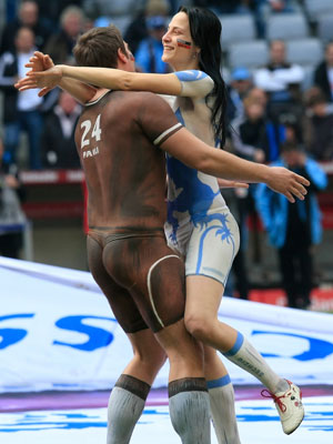 德乙聯(lián)賽第22輪,慕尼黑1860在主場(chǎng)以5:1大勝圣保利。 終場(chǎng)前從主客兩隊(duì)的看臺(tái)上分別躍下一個(gè)身穿1860隊(duì)服的姑娘和一個(gè)身穿圣保利隊(duì)服的小伙,兩人一路狂奔來到球場(chǎng)中圈,旁若無人的熱吻起來。仔細(xì)觀察才能發(fā)現(xiàn)他們所穿的“隊(duì)服”的奧秘----這對(duì)情侶都只穿了一條內(nèi)褲,他們身上的衣衫完全是足以亂真的人體彩繪。現(xiàn)場(chǎng)保安也為這浪漫一幕所感動(dòng),他們面帶微笑將這對(duì)情侶請(qǐng)出草坪。(圖片來源:1860隊(duì)官方網(wǎng)站)