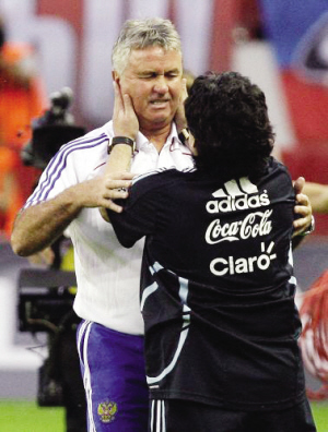 阿根廷昨天做客挑戰(zhàn)俄羅斯,所有的焦點都在兩隊主教練馬拉多納和希丁克身上,可惜荷蘭人再神奇也抵不上球王有一個神奇的女婿——憑借阿奎羅的兩傳一射,缺少梅西的阿根廷3比2逆轉(zhuǎn)戰(zhàn)勝了俄羅斯,為9月5日與巴西隊的世界杯預(yù)選賽找回了寶貴的信心。