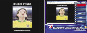 當?shù)貢r間周五,阿根廷TN電視臺報道了一起網(wǎng)絡(luò)襲擊事件,一名自稱為“KKR”的黑客襲擊了阿根廷足協(xié)官方網(wǎng)站(.ar),在阿根廷足協(xié)官網(wǎng)上放上了一張馬拉多納身穿巴西國家隊球衣的照片。