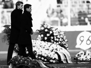 隨著德國(guó)隊(duì)隊(duì)長(zhǎng)巴拉克和默特薩克將一個(gè)花圈放在了恩克靈柩前,哀悼?jī)x式正式開(kāi)始,天主教神父普羅辛格致詞,“羅伯特·恩克不僅僅是一位偶像,對(duì)許多人來(lái)說(shuō),他也是一位理想的楷模。”漢諾威96俱樂(lè)部主席金德作為第二位致詞人出場(chǎng),“羅伯特·恩克不會(huì)再回到這個(gè)球場(chǎng)了,我們的心情非常沉重!