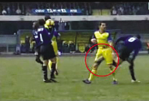 在本輪結(jié)束的國(guó)米與切沃的比賽中,盧西奧使出了一招“蝎子擺尾”,但是目標(biāo)卻是對(duì)手的襠部。