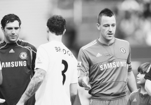 看臺(tái)上雙方球迷打出了支持各自球員的橫幅,與“特里之隊(duì)”相對(duì)的是“布里奇之隊(duì)”。開(kāi)場(chǎng)后,布里奇和特里有過(guò)一次直接面對(duì)面的機(jī)會(huì)。特里在大禁區(qū)左側(cè)拿球,布里奇在防守他,雙方并沒(méi)有糾纏太久,特里草草射了一腳門了事。